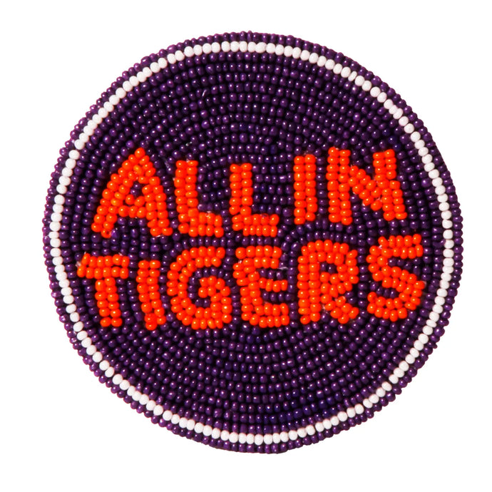 Clemson Tigers "All In Tigers" Beaded Button in Purple and Orange – Game Day Stadium Pin