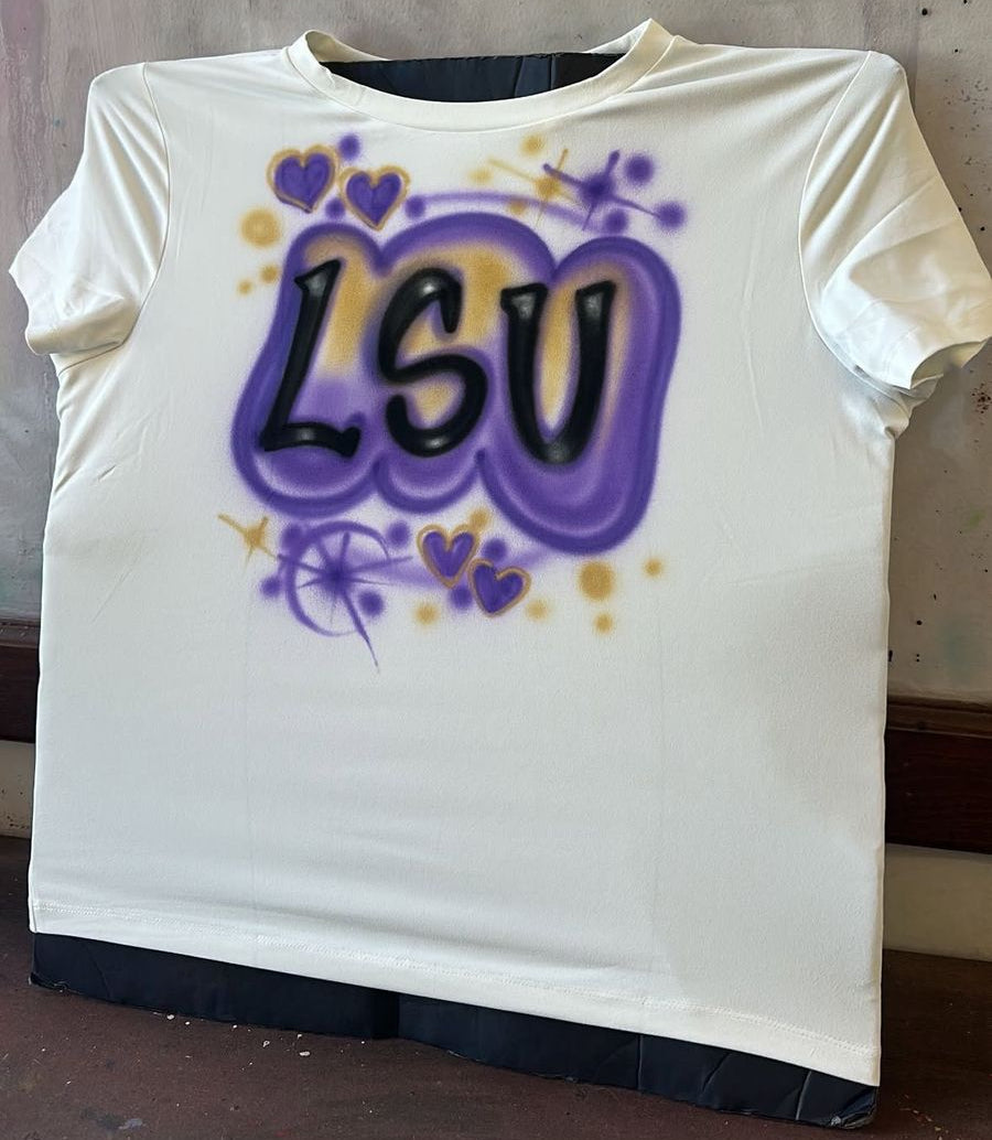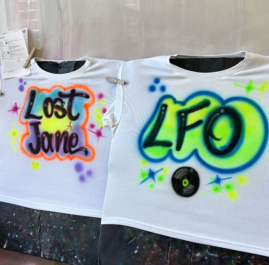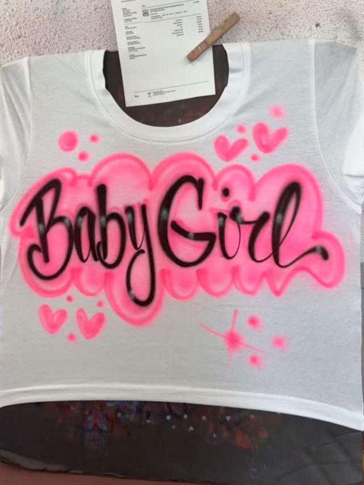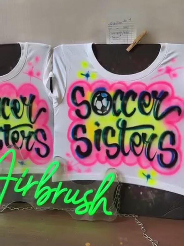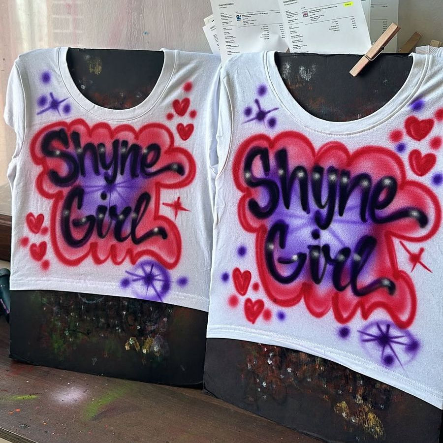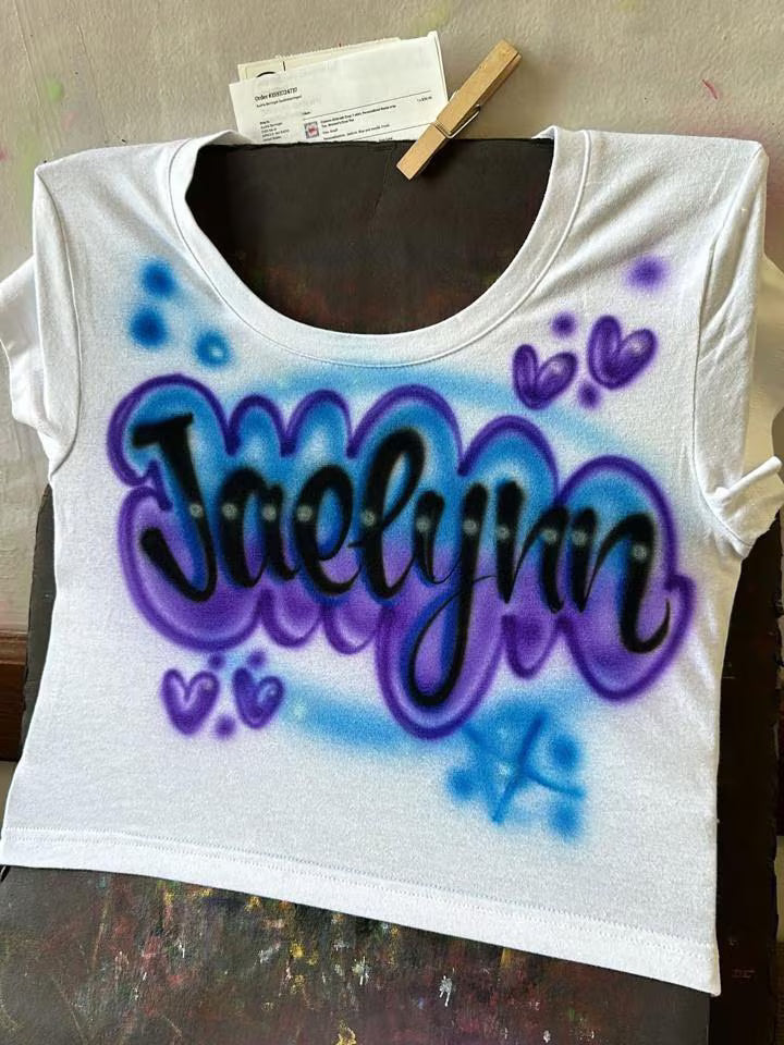 Each design is airbrushed on a standard slim-fit crop tee and includes up to TWO names or words with up to THREE specified COLORS.