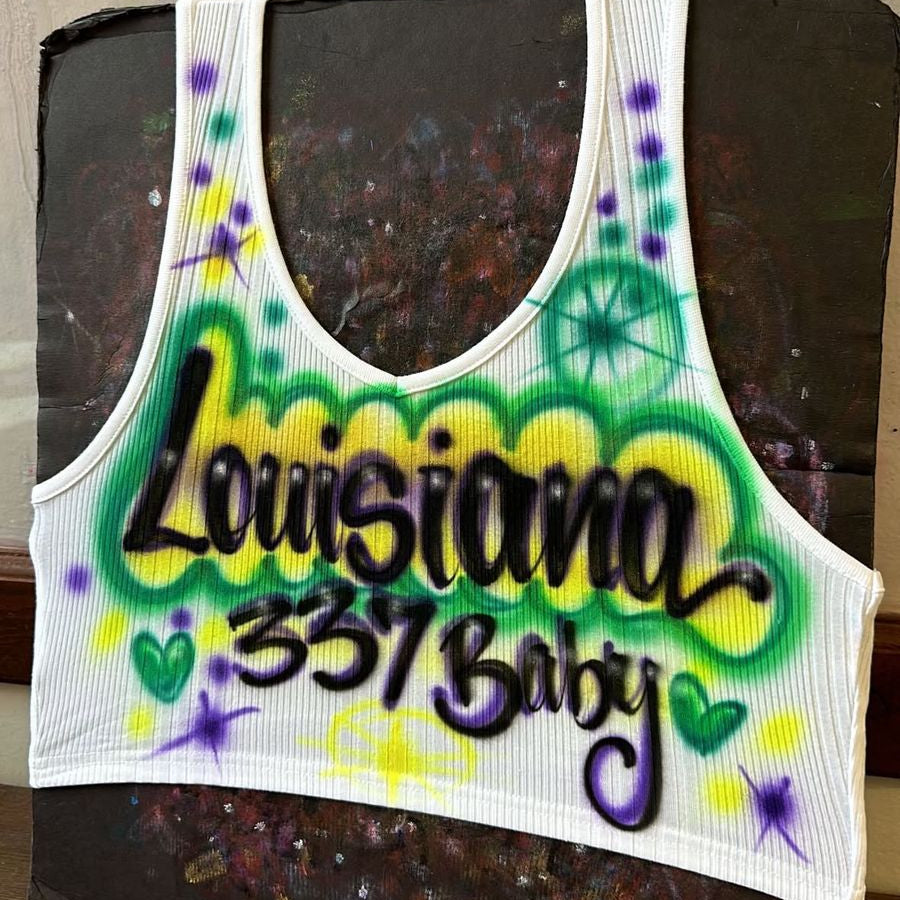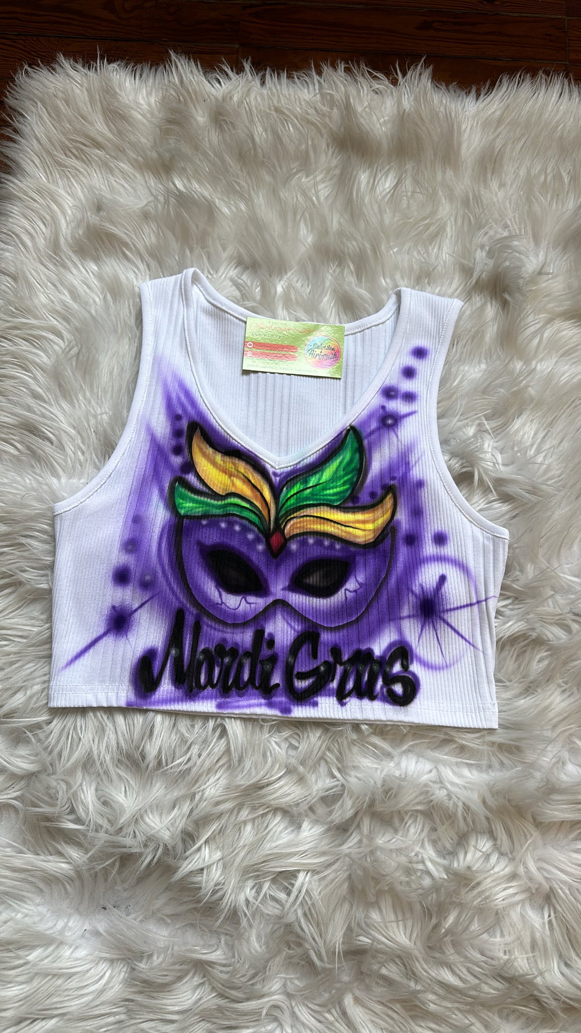 Our hand-painted ribbed V-neck crop tops are bright, bold, and full of Carnival spirit — each one made to order by our Texas-based artists. Perfect for Mardi Gras parades, concerts, parties, or matching krewe outfits!