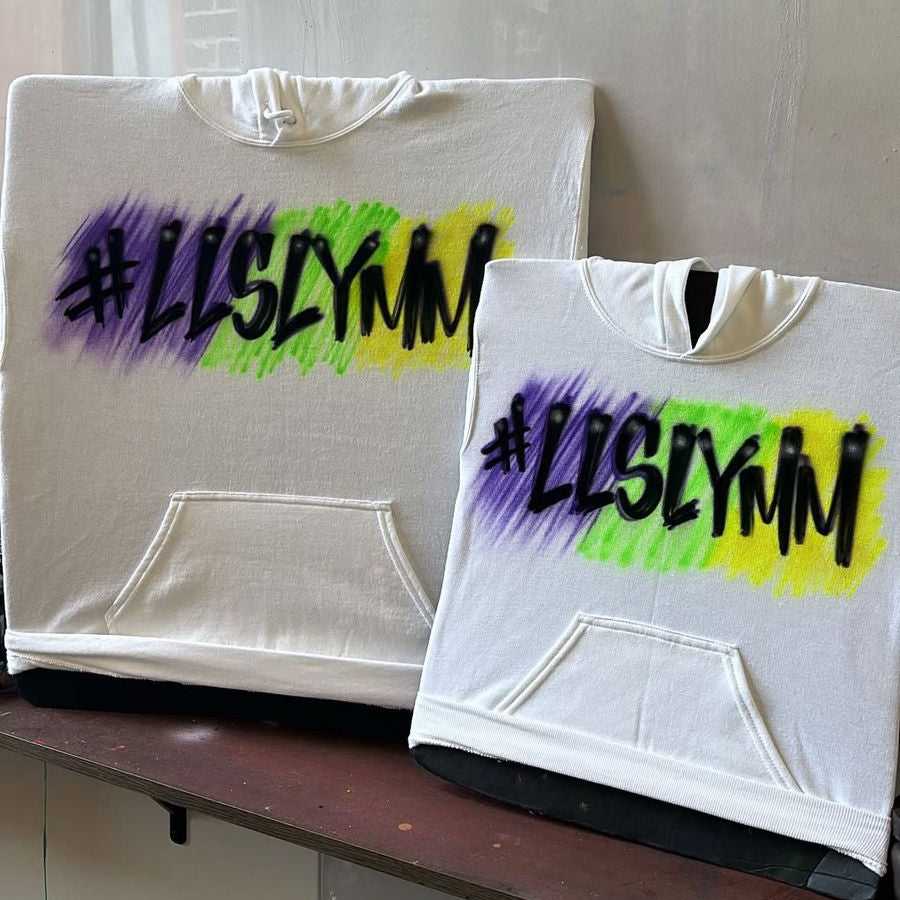 Each hoodie is a one-of-a-kind piece painted in the spirit of Mardi Gras, full of sparkle, color, and joy.