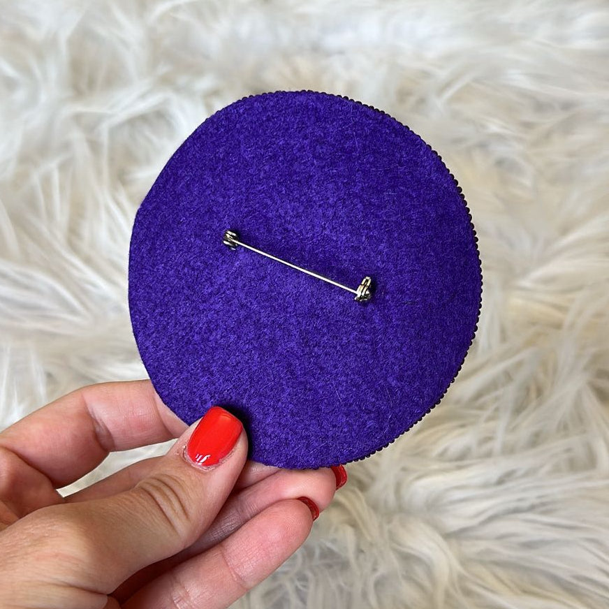 This vibrant circular pin features purple and yellow beads, bringing bold school spirit to your stadium look.